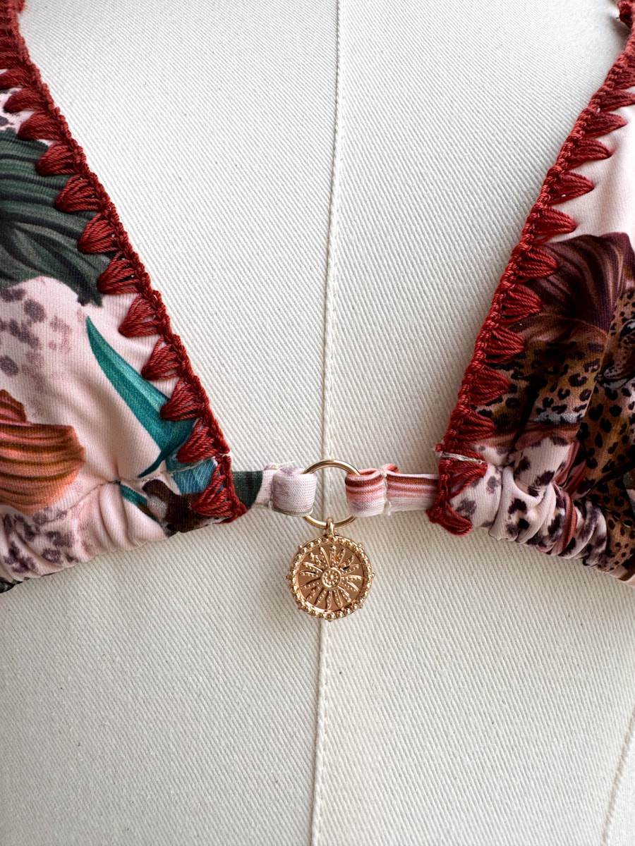 ¡Dale la bienvenida al verano con estilo y comodidad! Nuestro bikini de corte clásico en diseño triángulo combina un estampado tropical vibrante con detalles cuidadosamente terminados, como el ribete en contraste tejido que le da un toque artesanal y original.