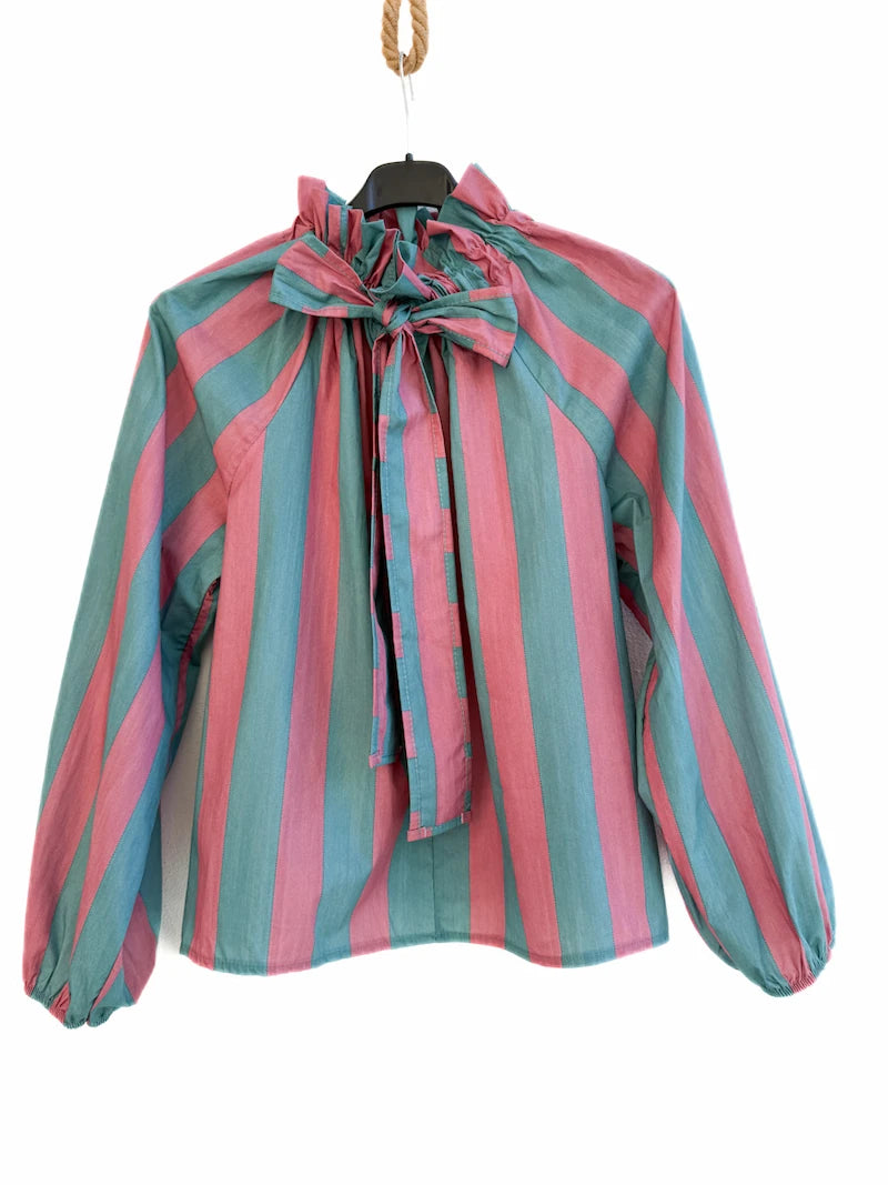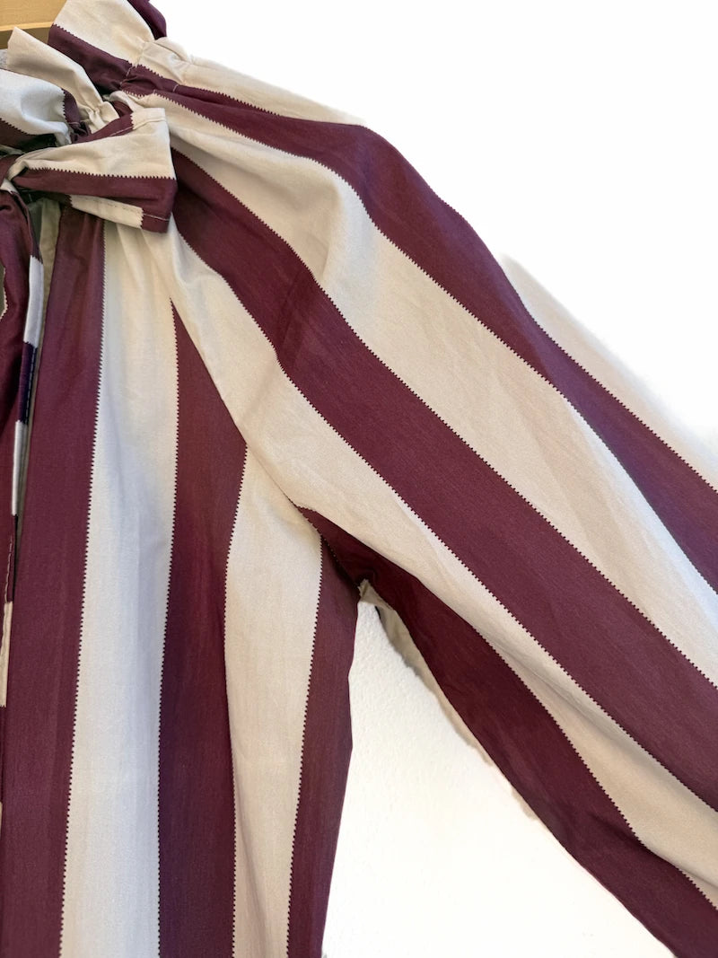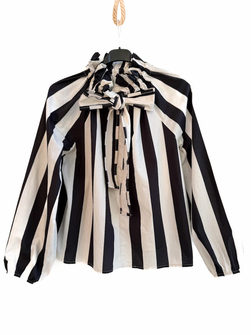 Blusa elegante de rayas verticales con lazo al cuello, perfecta para un look sofisticado y femenino. Confeccionada en tela ligera y suave al tacto, ofrece una caída fluida que estiliza la silueta y brinda comodidad durante todo el día. Su diseño de manga larga con puño delicadamente fruncido aporta un toque romántico, ideal para outfits formales o casuales chic.