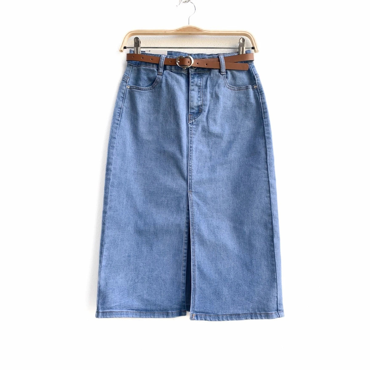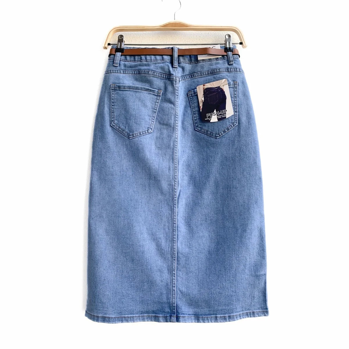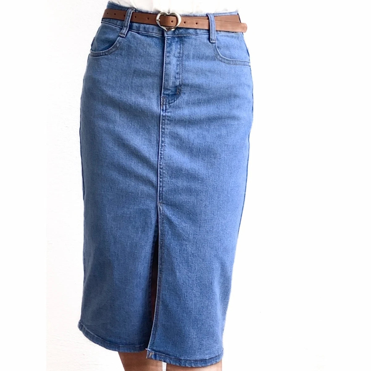 Falda vaquera de tubo con cinturón, cierra de cremallera con 4 bosillos, largo hasta abajo de rodilla.