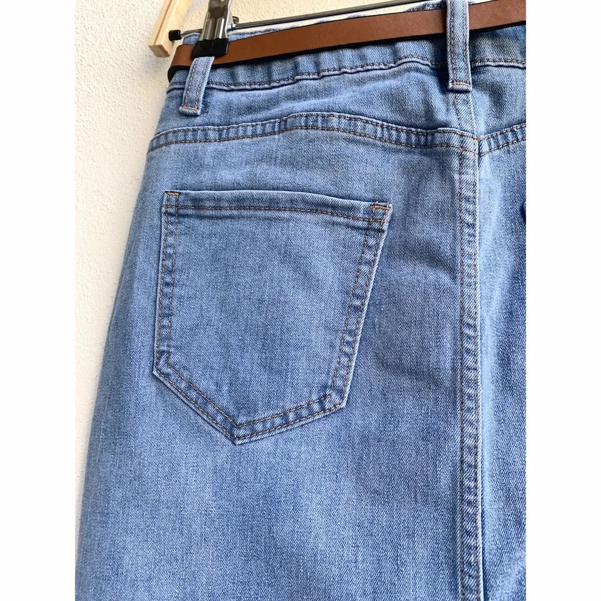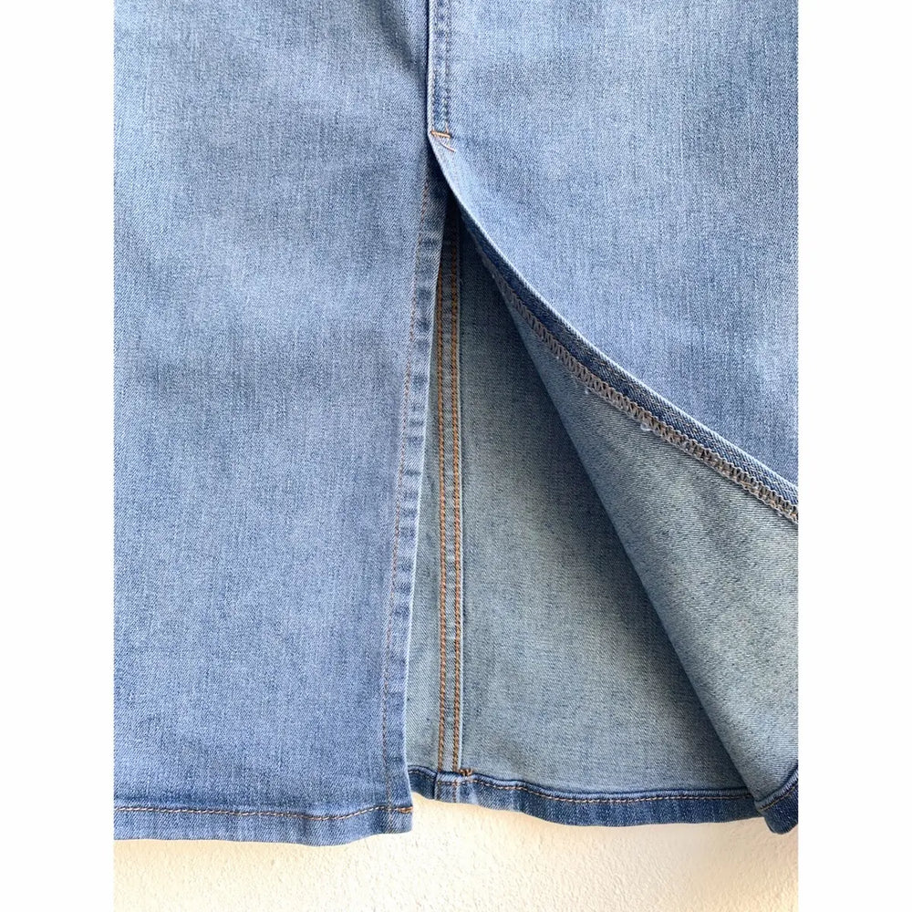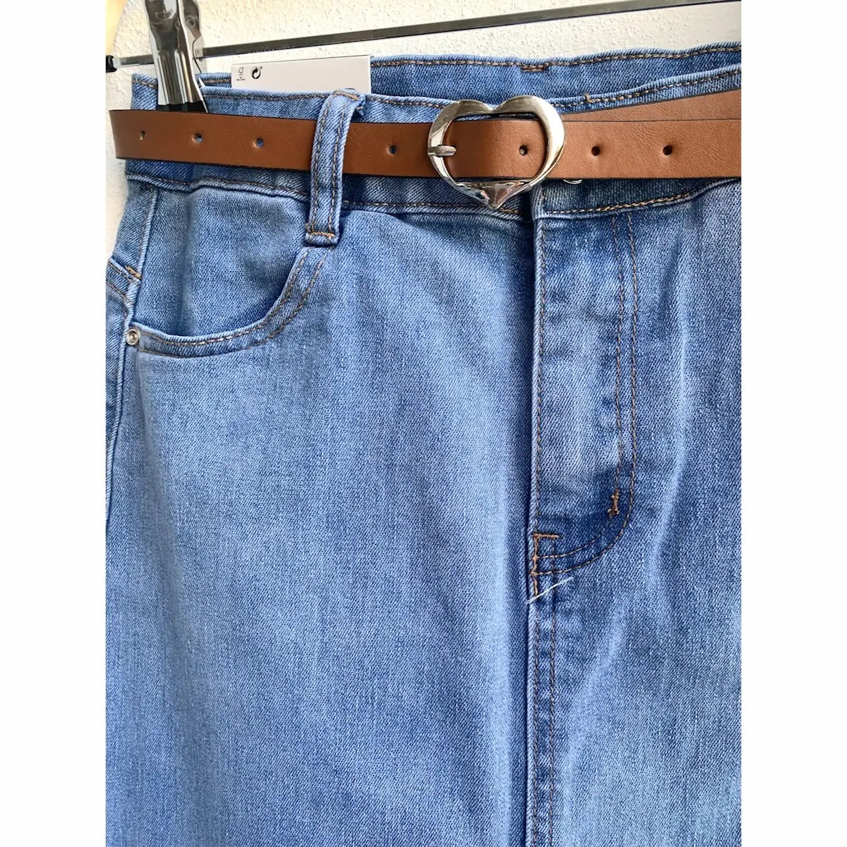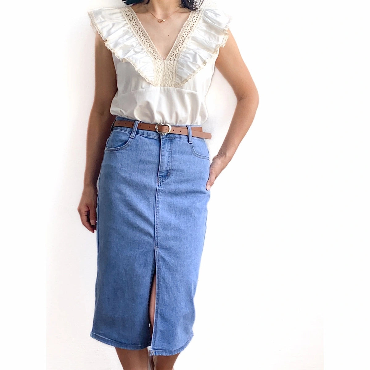 Falda vaquera de tubo con cinturón, cierra de cremallera con 4 bosillos, largo hasta abajo de rodilla.