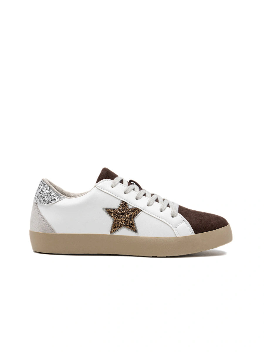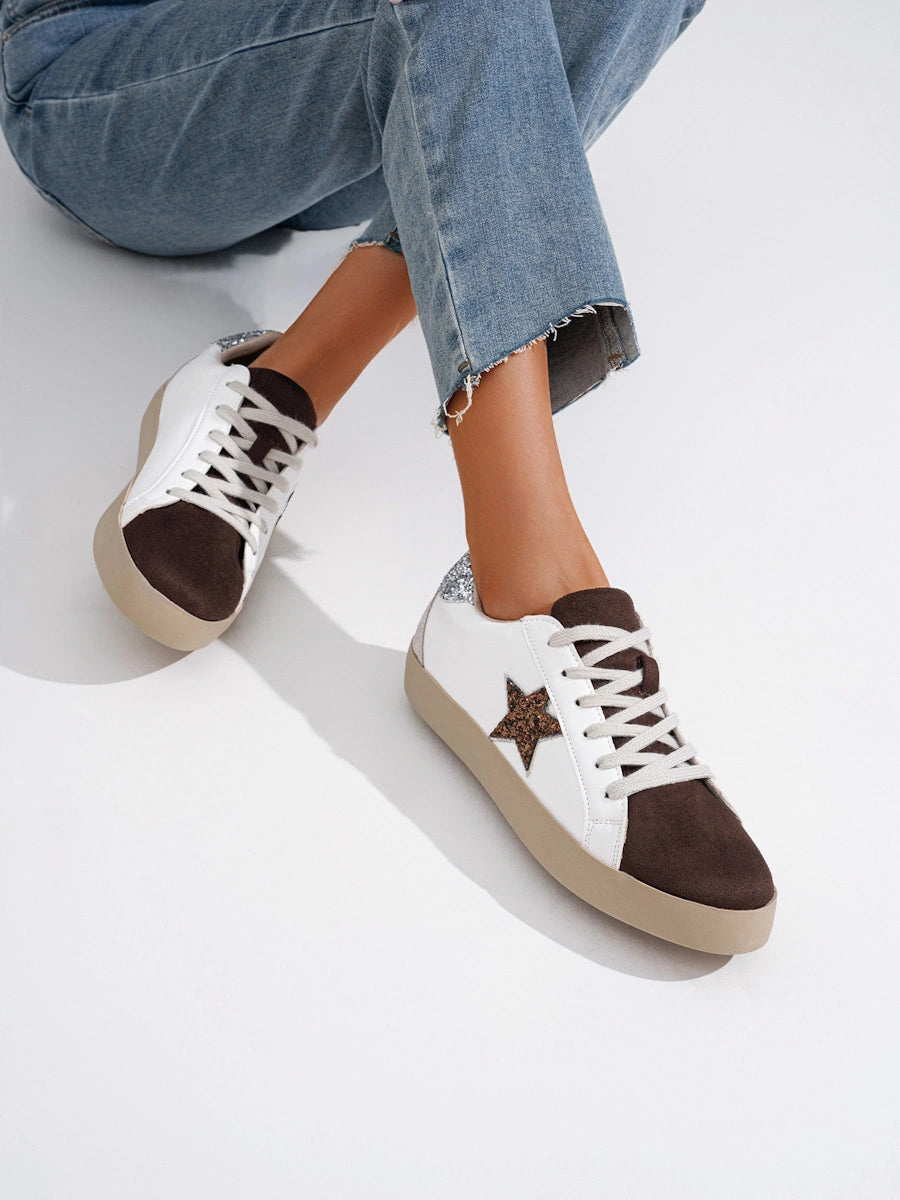 Zapatilla presentan un diseño contemporáneo de estilo urbano, caracterizado por una base de cuero sintético blanco que contrasta con una puntera de antelina en color café oscuro. El detalle más llamativo es una estrella lateral en purpurina dorada, que complementa el refuerzo del talón también decorado con brillo plateado. Con una suela plana de goma en tono beige y cordones clásicos, este calzado logra un equilibrio entre lo casual y lo sofisticado.